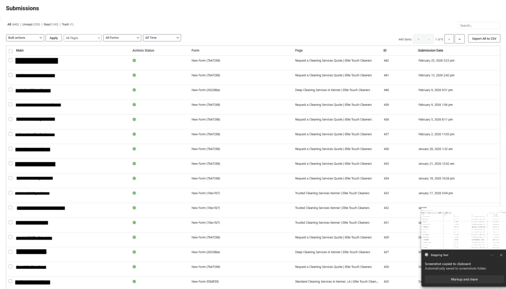 Elite Touch Cleaners had a site but almost no inbound leads. We rebuilt their web presence around conversion-focused SEO and dedicated service pages. Now they have a consistent form submissions flow from real potential clients, and it keeps growing.